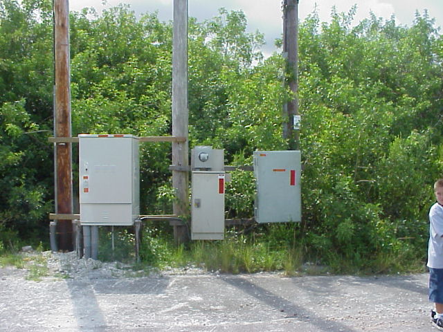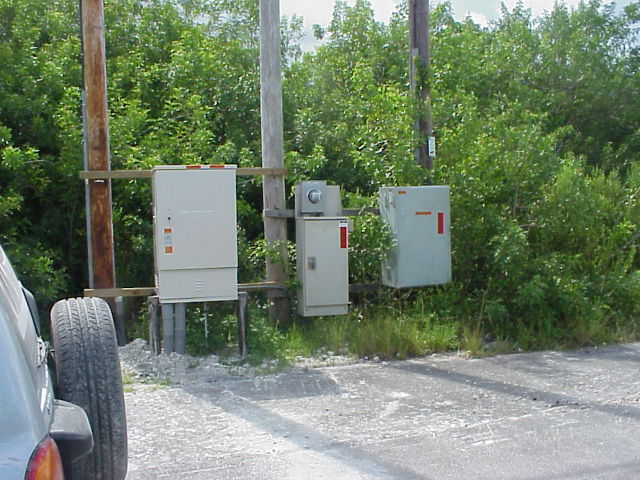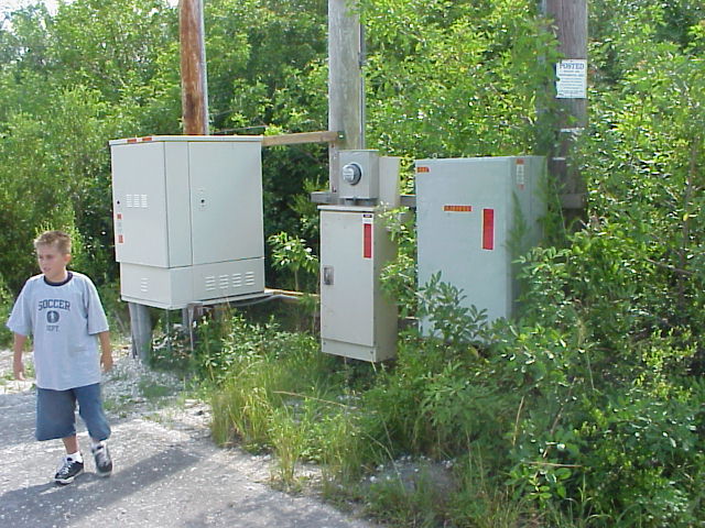 Out in the middle of no where, a new Telephone company SLIC. Fiber to copper pair conversion. A good location to set up a command post of a disaster, such as a plane crash. Power and Telephone in one place. As I understand the equipment: On the far left, a new fiber SLIC. This converts a fiber into many phone lines. The center box below the FP&L meter is a power supply for the fiber equipment. I think the box on the right is an older system that does the same thing but from T1s on copper, not fiber. Feel free to correct me on any of this. Can anyone find this on the aerial photography for me? I didn't take note of the coordinates. 07/15/2003 |