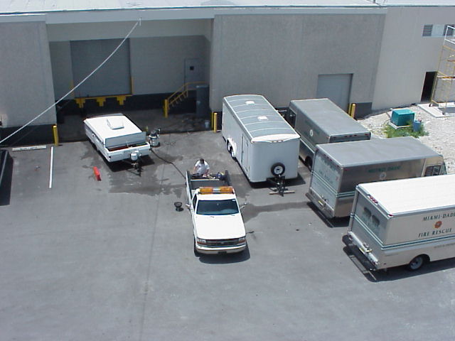 At the rear of the Fire HQ and EOC is another large building that contains all the equipment that keeps the operation running. Here are some pictures taken during Field Day 2001. I'll try to describe them the best I can. Here's the front of the Utility building as viewed from above the EOC.